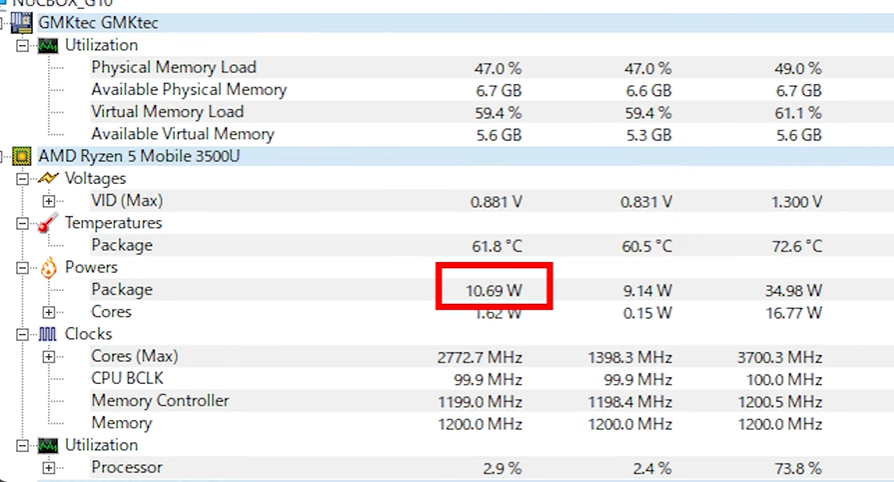 アイドル時のCPU温度は約61.8℃、消費電力10.69W。Netflix再生時は68℃前後、消費電力12.8W。